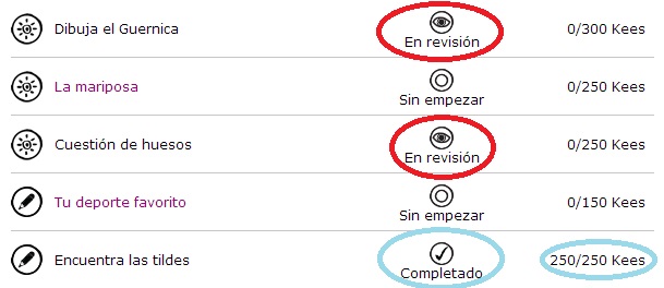 Los hay de diversos tipos, a mi por el momento me aparecen 12 diferentes y se pueden ir haciendo los que se desean. Algunos tienen fecha de caducidad (he visto 1 ó 2) y se supone que van apareciendo nuevos retos cada cierto tiempo. Casi todos los retos están relacionados con lo que se supone que hemos aprendido en el colegio: ortografía, los huesos del cuerpo humano, mitología.. pero todo lo plantean de una manera más divertida porque los convierten en juegos. Pero también hay que tener en cuenta que algunos retos son manuales (hay de recetas, manualidades, dibujar...).Ejemplo de retos:- En "encuentra las tildes" te ponen un texto de unas 20 líneas en el que faltan acentos y te piden que busques las palabras, las escribas correctamente y señales en qué línea del texto estaba esa palabra. ¿Fácil no?- En "crucigrama: mitología" hay un crucigrama de dioses mitológicos que hay que imprimir y hay que rellenarlo con los datos que te dan. También es muy fácil y así podemos ir repasando^^- En "un bizcocho" hay que preparar un bizcocho e ir sacando fotos de los pasos que te piden y hacer un montaje con las fotos que te piden, además debe aparecer la palabra "KEEPUNTO" para evitar trampas.- En "la mariposa" hay que hacer mariposas de papel de colores (mínimo 5) y ponerlas en un lugar bonito (como un jardín) y sacar una foto artística. También tiene que aparecer la palabra KEEPUNTO.Como veis son muy diversos y yo sólo os he puesto 4 ejemplos así que imaginad todo lo que se les puede ocurrir xDDD¿Cómo se puntúa?