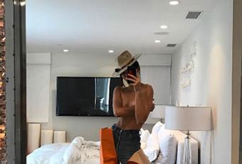 La modelo de 20 años de edad, Kendalla Jenner compartió una fotografías en topless a través de su red social instagram, opto por lucir un par de jeans, un sombrero y unos máximos de muslo de color naranja brillante, acompañado de unas botas de son increíbles mancha de la colaboración Vetements X Manolo Blahnik y y su costo sobrepasa los $5000.