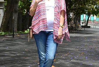 Hoy les enseño este look con kimono que llevé ayer mismo para disfrutar del día de descanso. La tela, a diferencia de éste del año pasado, es muy ligera y al ser una prenda ancha no tendré problema en llevarla hasta el final del embarazo.
