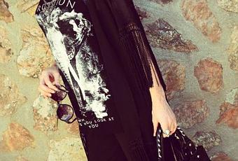 Muy buenos días! Última semana del mes y yo de vacaciones. Esta semana estoy por Portugal, si queréis seguir mis andanzas, lo podréis hacer por mis redes sociales. Comenzamos esta semana más cortita, con este total black. El kimono que llevo, de la colección de Aversy, es de gasa con adornos de flecos. Lo he combinado con una camiseta con mensaje y unos culottes negros y stilettos. Un look muy boho al que también he añadido mi bolso de flecos. Reconozco que antes era más de negro, últimamente he ido incorporando más colorido a mis looks. Los sombreros me gustan mucho y este modelo fedora de Stradivarius, reconozco que me ha conquistado.