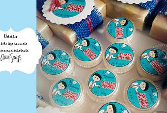 Los jabones fueron de chocolate y para su decoración se escogió cinta de tela en color azulón y una bonita etiqueta en blanco y azulón que fue prendida con un cordón color rojo.