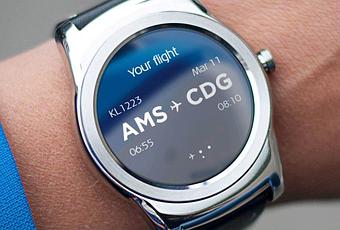 Siempre a la vanguardia con la tecnología, la Real Compañía Holandesa de Aviación KLM, inicia un periodo de pruebas con el reloj inteligente “Android” (“smartwatch”), un nuevo proyecto que ofrecerá a los pasajeros información específica sobre su vuelo. Además de proporcionar sus tarjetas de embarque, la aplicación ayuda con todos los temas relacionados con el aeropuerto.