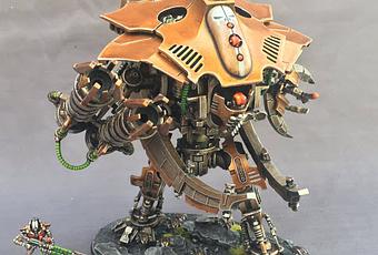 Esta muy bien a todos los niveles, desde las piezas escogidas al pintado pasando por el montaje. La base ha sido un Knight imperial al que se le han añadido un montón de piezas de todo tipo de los Necrones. El color escogido va, ademas, perfectamente con los tonos verdosos típicos de las armas Gauss.