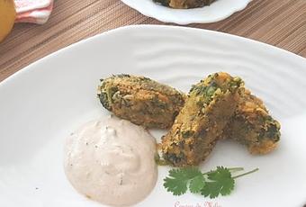 - Añadimos las espinacas a la pasta de garbanzos. espolvoreamos con la harina de garbanzos y con dos cucharas formamos croquetas que vamos colocando en una fuente.