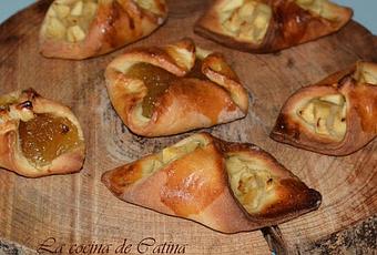 Precalentar el horno a 180 grados.Cubrir una bandeja de horno con papel sulfurizado. Sacar la masa del frigorífico y en una superficie enharinada extenderla con un rodillo. Formar un rectángulo de unos 3 0 4 milímetros de grosor. Dividir la masa para que salgan unos 30 cuadrados y colocarlos en la bandeja del horno. Echar una cucharada de daos de manzana en el centro de cada cuadrado de masa. Doblar dos esquinas opuestas del cuadrado de masa por encima de las manzanas y pellizcar las puntas.