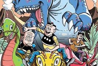 La mayoría son historietas de una página con seis viñetas, como la de la imagen superior, en la que encuentra un huevo de dinosaurio eclosionado, otra en que participa en una excavación arqueológica y encuentra una vasija primitiva con un dinosaurio dibujado u otra en otra coloca unos cuernos a un dinosaurio en el museo, pero también protagonizó algunas historias largas como 《远古奇观》yuǎngǔ qíguān (Maravillas antiguas), en la que viaja con sus amigos al Mesozoico, que puedes leer entera aquí si dominas el mandarín. Además, en el nº 341 de su cabecera participa en una carrera a lomos de dinosaurios [4] –en el 267 le vemos rodeado de dragones, aunque alguno nos parece un dinosauroide- y en el nº 364 se dispone a torear a un triceratops, capote en mano.