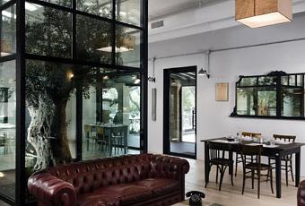 Noses Architects. Un espacio acogedor con una mezcla muy interesante de materiales, la frialdad del cemento, la calidez de la madera y la personalidad del mobiliario. Una combinación de tradición y modernidad tanto en el diseño como en la comida. Un espacio de estilo industrial y vintage con un árbol como principal protagonista.