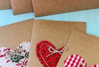 ¡Me han encantado estas tarjetas! ¡Son preciosas! Creo que son las próximas que enviaré... Me encanta la sencillez del kraft mezclada con los corazones de tela... Y por supuesto, el detalle del lazito de cuerda en el sobre, le da el toque final.