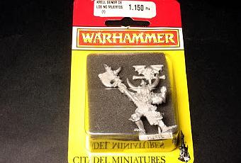 No podía hablar ayer de Heinrich Kemmler sin hablar también de Krell. Krell, igual que Heinrich Kemmler, es uno de los personajes especiales más antiguos de Warhammer, pues apareció por primera vez en la segunda edición de Warhammer Fantasy Battle, en la campaña "Terror of the Lichemaster". Igual que Heinrich Kemmler éstas antiguas figuras no las tengo ni tampoco las he visto salvo en catálogo. La miniatura apareció en el 26 de Junio de 1995 para la 4ª edición de Warhammer Fantasy Battle siendo anunciada en el número 11 de la edición española de la revista White Dwarf de Julio-Agosto de 1995.