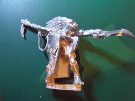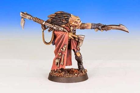 De las figuras de "xenos" que se han usado en el GD,hay una que me gusta especialmente,que es la del "Kroot Shaper" o Gran Kroot que se hizo para el GD 2001.Obra de Brian Nelson,esta figura de metal es de una sola pieza y como veis representa a un gran Kroot señalando con un cuchillo mientras acuna su rifle Kroot con el otro brazo y se tapa con un manto que tiene huesos enganchados y entretejidos con el.Hay una cosa curiosa del blister de esta figura.Lo que en español se ha traducido como "Gran Kroot",si lo tradujéramos literalmente sería "Formador Kroot"(Shaper es "el que da forma").Los Gran Kroot se encargan entre otras muchas cosas de determinar que es adecuado para consumir por los Kroot y que es bueno para que los Kroot evolucionen y ganen nuevas habilidades sin volverse animales o bestias.Pero en español,Gran Kroot viene hacer referencia a su rango superior entre los demás.Sin embargo,en el blister de esta figura metieron la pata,ya que tradujeron "Shaper" como "Francotirador",al confundirlo con "Sniper".Así que no es raro que en alguna guía o web salga esta figura como "francotirador Kroot",aunque en realidad no lo sea.