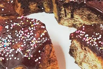 Mezclamos las almendras molidas con la harina. Batimos los huevos con el azúcar y el estracto de vainilla, hasta que doble su volumen. Incorporamos poco a poco la mezcla de harina, removiendo lentamente. Añadimos el chocolate y removemos un par de veces para crear el efecto mármol. Vertemos la mezlca en el molde y metemos en el horno unos 30 minutos o hasta que esté firme (esto, una vez más, dependerá de nuestro horno). Dejamos enfriar en el molde unos 10 minutos y desmoldamos sobre una rejilla, hasta que enfríe. Para cubrirlo, calentamos un vasito con agua, mezclamos el azúcar glass con el cacao y echamos muy poco a poco el agua, removemos, hasta tener una textura apta para cubrir. Que lo disfrutéis.