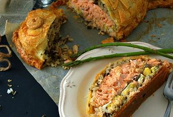 En el siglo XIX, los chefs franceses descubrieron este fabuloso pastel y el maestro Escoffier lo incluyó en su "Biblia" de 1903 con el nombre más afrancesado de "coulibiac". A partir de entonces, el pastel ruso se paseó por toda Europa. Hoy en día, no sólo se hace con masa de pan, sino también con hojaldre, como el que yo he hecho, y con rellenos diversos, aunque los básicos son un pescado (salmón, bacalao,...), arroz, huevos duros y champiñones.