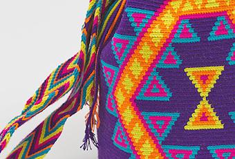 Los bolsos, de vivos colores y estampados geométricos, están tejidos a mano por una comunidad indígena colombiana