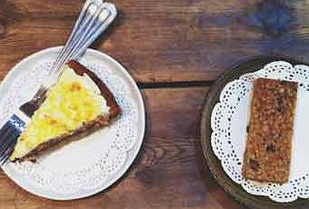 Huele a café recién molido y a pastas. Se acercan al mostrador y se sienten como Hansel y Gretel delante de la casita de chocolate. No hay por donde empezar, no es posible escoger entre tanto dulce exquisito. Terminan decidiéndose por un trozo de tarta de zanahoria vegana y un flapjack acompañados de dos chai lattes con leche de soja.