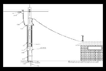 Figura Nº 1: Acometida aéreaLa acometida también se puede entender como la línea aérea o subterránea según sea el caso que por un lado enlaza con la red eléctrica de alimentación y por el otro tiene conectado el sistema de medición y estará conformada por los siguientes componentes: Punto de alimentación, conductores, ductos, tablero general de acometidas, interruptor general, armario de medidores o caja para equipo de medición. Criterios de diseño de las acometidas:· Los conductores que forman parte de la acometida deberán ser continuos y de sección uniforme, desde el punto de conexión de la red hasta los bornes de la entrada del equipo de medida. Es decir no debe tener empalmes, ni derivaciones, ni diferentes calibres en ningún tramo de esta.