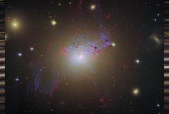 También conocida como Perseo A, NGC 1275 se expande más de 100.000 años-luz y se encuentra a unos 230 millones de años-luz de distancia.
