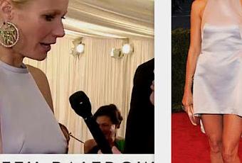 Gwyneth Paltrow deslumbró con un vestido corto de Prada en lavanda suave con apliques metálicos en los bolsillos, escote halter, con un corte de tendencia tail hem (muy actual) y espalda al aire. Completó su look con el tacón joya de sus peeptoes.