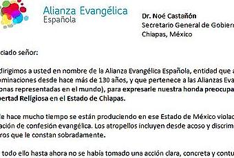 La Comisión de Libertad Religiosa de la Alianza Evangélica Española ha expresado su preocupación «por la situación de los Derechos Humanos y de la Libertad Religiosa en el Estado de Chiapas». La carta explica que «desde hace mucho tiempo se están produciendo en este Estado de México violaciones de toda clase contra la población de confesión evangélica. Los atropellos incluyen desde casos de acoso y discriminación hasta asesinatos y expulsiones».