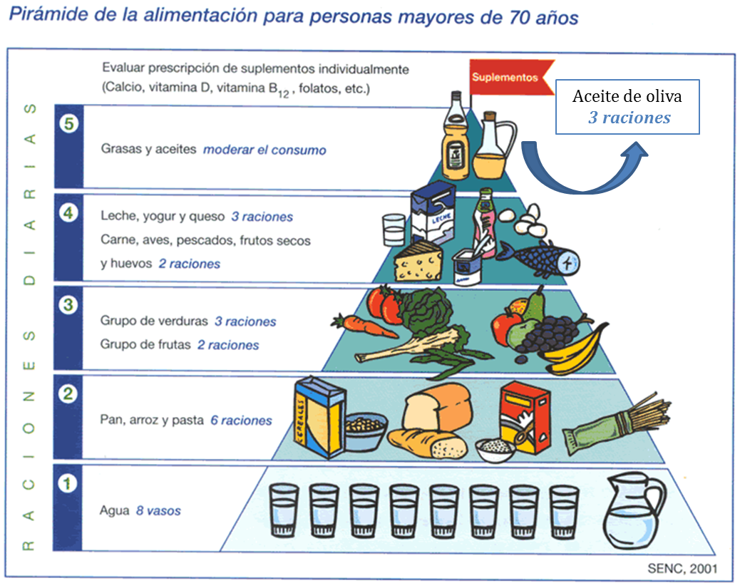 -Realizar cinco comidas al día: realizar un buen desayuno y una cena ligera.-Beber 8 vasos de agua al día (1,5-2l) en forma de zumos, sopas, caldos vegetales aunque no se tenga sensación de sed.-Evitar bebidas carbonatadas, café y alcohol. -Dieta rica en verdura: alternar cruda y cocida durante el día en forma de ensalada, En caso de dificultad para masticar y deglutir:-Estricta higiene bucal.-Evitar alimentos pegajosos y fibrosos: frutos secos, caramelos.-Potenciar alimentos blandos: flanes, natillas, helados, arroz, quesos suaves, verduras cocidas, frutas maduras, tortilla, purés. -Añadir: salsas, nata, caldo. -Buena hidratación.-Variar los tipos de cocciones: cocido, hervido, estufado.-En la elaboración de triturados como purés:-Añadir leche para potenciar gusto y sabor en carnes y verduras.-Triturar la carne a parte y después añadir.-Tortilla o revuelto. -Cuscús, humus, compota de fruta, membrillo.-Añadir queso rallado. -En el puré de patata añadir zanahoria u otras verduras.-Triturar las legumbres cocidas.-Utilizar sémola de arroz o pasta (menos grumos).-Añadir aceite de oliva.-Si no es consumido al momento conservar a la nevera o congelar.-Utilizar aguas gelificadas en caso de disfagia (dificultad para deglutir). -Comer incorporado (bien sentado). , al horno, hervida, etc.).-Dieta rica en fruta: zumo, macedonia; si quitamos la piel se pierde fibra y si se cuece se pierden vitaminas.-Potenciar las legumbres: mejor digestión en forma de puré.-Potenciar los lácteos (ricos en calcio).-Los cereales son la base de la alimentación: pasta, arroz, pan, etc. Para obtener grasas de buena calidad introducir pescado azul dos veces a la semana y frutos secos. -Alternar la carne con el pescado y los huevos. Combinar las legumbres con pescado o huevo de segundo plato para que el aporte de proteínas sea equilibrado y de digestión menos pesada. -Distribución de los postres:-Cada día habrá un lácteo para el almuerzo o la cena. -Si hay alguna comida que pueda causar flatulencias (legumbres) tomar un yogurt de postres para no tener tantas molestias digestivas. -En ocasiones se puede comer helado, flan, natillas. El helado puede ser de yogurt y añadirle trozos de fruta. -Se pueden realizar gelatinas de fruta con cola de pescado, etc. -Adaptar los métodos de cocción según las estaciones: sopas y cremas en invierno y ensaladas de pasta, arroz o legumbres en verano.-Condimentar con especies y vigilar con la sal.-Realizar ejercicio físico (andar 30 minutos al día).-Realizar ejercicios mentales.-Exponerse al sol para facilitar la obtención de vitamina D.En la tercera edad podemos encontrarnos en distintos casos, los más frequentes:1. La pérdida del apetito, se recomienda:-Dividir en 5-6 comidas al día en pocas cantidades.-Aprovechar los momentos del día que se tenga más hambre para comer.-Añadir alimentos calóricos: frutos secos, queso cremoso, mantequilla, miel, azúcar, mayonesa, bechamel, nata, salsas, tapioca, galletas, batidos, helados, manteca de cacahuete, fruta con almíbar.-Añadir alimentos proteicos: lácteos, queso rallado, huevos, carne, pescado, legumbres, leche en polvo descremada, atún, virutas de jamón. -Utilizar: bebida de soja, de almendras, de arroz; leche entera y yogurt entero. -Beber agua fuera de las comidas.-Realizar actividad física y social. -Buena presentación de los platos. -Variar los tipos de cocciones. -Realizar las comidas en un entorno relajado. -Consultar al médico si es necesario una dieta y/o suplementación.