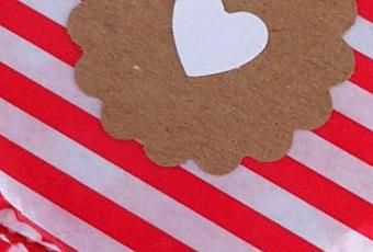 Compre una colección de tarritos y los rellené con esta sal bretona. Luego para cubrirlos utilicé los unos papeles para cup-cakes rayados en blanco y rojo que compré hace un montón de tiempo atrás en IKEA (ya sabéis cómo me gusta dar un uso distinto a los objetos cotidianos). Los até con un cordel bicolor rojo y blanco y rematé la parte superior con un troquel en cartulina color kraft y un troquel de un corazón en cartulina grabada blanca.