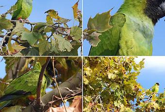 Una Aratinga ñanday posada sobre una rama de plátano de sombra (Platanus × hispanica), especie muy común en las calles y parques de Barcelona. Su silueta verde contrasta con las hojas que empiezan a tornarse ocres con el otoño. Estas cotorras aprovechan los huecos naturales de este árbol híbrido para anidar, ya que sus cavidades ofrecen buena protección frente al viento y a los depredadores urbanos.