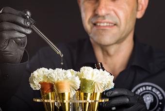 Por otro lado, en la compañía que lidera Santiago Mohedano se combinan diferentes quesos de gran calidad y de origen nacional de oveja, cabra y vaca con 5 de sus cucuruchos de sabores ( espinacas, tomate, chocolate, carbón vegetal y neutro) maridados con unas gotas de AOVE Arbequina y Arróniz con diversas esencias naturales como; naranja, canela, nuez, hierbabuena, tomillo, cardamomo, manzana, azahar, y con unas emulsiones dulces en sus cucuruchos para refrescar y limpiar el paladar para poder seguir disfrutando de otras variedades de Flores de Queso proporcionando alrededor de 250 combinaciones posibles al momento.