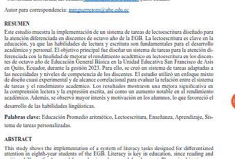 Resumen: Este estudio muestra la implementación de un sistema de tareas de lectoescritura diseñado para la atención diferenciada en discentes de octavo año de la EGB. La lectoescritura es clave en la educación, ya que las habilidades de lectura y escritura son fundamentales para el desarrollo académico y personal. El objetivo principal fue diseñar un sistema de tareas para la atención diferenciada con la finalidad de mejorar el rendimiento académico en lectoescritura en los discentes de octavo año de Educación General Básica en la Unidad Educativa San Francisco de Asís en Quito, Ecuador, durante la gestión 2023. Para ello, se creó un sistema de tareas adaptadas a las necesidades y niveles de competencia de los discentes. El estudio utilizó un enfoque mixto de diseño cuasi experimental y de alcance correlacional para evaluar la relación entre el sistema de tareas y el rendimiento académico. Los resultados mostraron una mejora significativa en la comprensión lectora y la expresión escrita, así como un aumento notable en el rendimiento académico. Además, se observó mayor interés y motivación en los alumnos, lo que favoreció el desarrollo de las habilidades lingüísticas.