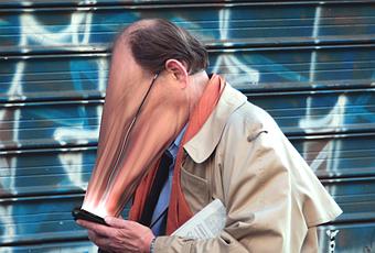 Hacer contacto visual, una hazaña una vez inevitable cuando se está en un vagón de tren lleno de gente o museo, ahora es una misión casi imposible, ya que los que te rodean están casi garantizados van a ser aspirados en la pantalla de su teléfono mientras se desplazan a través de Facebook o matar zombies digitales. Nuestra creciente dependencia de los dispositivos de información constantemente pegados a nuestras manos fue la inspiración para la serie SUR-FAKE del artista Antoine Geiger, un grupo de fotografías digitalmente alteradas que representan personas al azar siendo aspiradas por las pantallas de sus teléfonos.