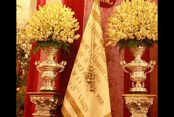 Se decide entonces la confección de la bandera para dejar constancia de este Voto Mariano y para que estuviera presente cada año cuando, el mismo, se renueva solemnemente durante la Función Principal de Instituto de la Hermandad, el 8 de septiembre, en el momento del Ofertorio y la Protestación de Fe, para lo que sube, junto al libro de reglas y la representación de la Junta de Gobierno, al presbiterio del altar mayor. Se trata de una insignia modesta que se encargó, según consta en la factura que se guarda en el archivo de la hermandad, a la empresa familiar de ornamentos religiosos Casa Rodríguez, y se confecciono en raso blanco, color litúrgico de la Santísima Virgen, y el propio de la fiesta canónica de su Realeza Universal, y letras de tisú de oro, con la leyenda: “La Hermandad de la Divina Pastora de Cantillana en unión de la primitiva Hermandad de Sta. Marina emitió por vez primera el Voto de la Realeza Universal de la Stma. Virgen. Noviembre de 1950” la bandera se ensartaba en una vara de metal plateado rematada por el anagrama de María timbrado por corona real, también del mismo material.