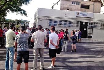 Tal y como estaba anunciado, los técnicos del fútbol base del Hércules y sus tres coordinadores, Eduardo Rodríguez, Francisco Escudero y Gaspar Campillo, acompañados de un buen número de padres y su hijos, además de representantes de la plataforma Por un Hércules Limpio se concentraban en la puerta cero del Rico Pérez para denunciar el impago de sus salarios, en la mayoría de los casos, desde el pasado mes de enero.