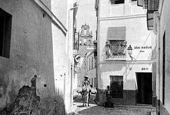 Centrándonos en la fotografía nos llama poderosamente la atención el vendedor a lomos de su borrico con las alforjas llenas y un chavalín que bien pudiera ser su hijo, una estampa muy repetida por las calles de Sevilla en aquellos años...