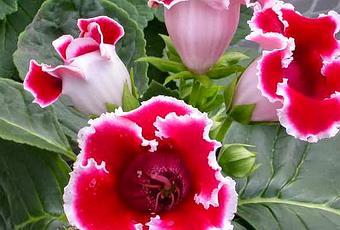 Estos híbridos modernos tienen flores de forma acampanada y de colores brillantes, las hojas son aterciopeladas y de un verde intenso. Las flores varían en color desde el rico carmesí, rojo oscuro, violeta y blanco a varias combinaciones de estos colores. Las gloxinias tigrinas tienen flores con un gran número de manchas o delicadamente veteadas en estos colores sobre un fondo blanco.