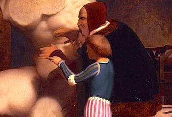 El pintor francés imaginó a un Miguel Ángel ciego tocando con sus manos el torso perfecto del estilo clásico helenístico más elaborado de la historia. Sin embargo, no era posible que un ciego pudiera estar solo, sin dirección, ante unas obras almacenadas como parte de unas piedras sin terminar o, como ésta, fragmentada. Así que idea a un lazarillo para guiar las manos del gran artista florentino. El niño ahora dirige las manos del escultor insigne para que pueda sentir el perfecto acabado sublime de una obra helenística tan extraordinaria. Con ello conseguiría el pintor romper la fragmentación, ya que al tocar una parte sin poder mirar nada la mente humana alcanza a completar cualquier otra parte necesaria. Así acabaría viendo el imaginado Miguel Ángel la escultura completa gracias a sus manos más que a sus ojos. Es como se puede glosar mejor la Belleza incompleta, es como se puede perfeccionar una sensación de algo que no está del todo terminado o completado o proporcionado incluso. La mejor forma de enseñarla o de aprehenderla. Es la única forma también de completarla cuando está rota, cuando no es más que la parte de algo que existió una vez y ya no volverá a ser como antes. Porque no tiene sentido verla así, no puede ser representada con sus formas originales para ser vista en su totalidad grandiosa. No, ahora es otra cosa. Es la idea, es la parte que está, por su sentido de pertenencia, adherida a la verdad de lo que algo representa, aunque no sea visto ya así, aunque no corresponda en su conjunto visual a lo que fue una vez perfecto. La Belleza es idea más que forma. Y esa idea puede fortalecer cualquier parte de un conjunto fragmentado, hasta hacerla partícipe de la profundidad de lo que representa una Belleza. Sólo pudo el pintor de la visión perfecta magnificar la Belleza incompleta usando el recurso de lo que más pudiera suponer ahora para completarla. De lo que justificara así la representación de algo que nunca alcanzaría a ser Belleza... A menos, sin embargo, que pudiera recomponerse, o, como en este caso, poder vislumbrarse ahora a través del tacto tan sagrado de unas manos anhelosas.