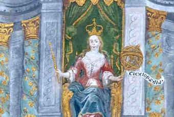Una gran pintura del techo de la biblioteca muestra una representación de la sabiduría con esfera armilar en la parte superior de una escalera bordeada de leones: el ascenso en el conocimiento flanqueado por fieras.