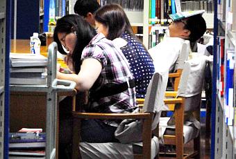 Una de las tardes que estuve en esta megaurbe fui a ver su biblioteca municipal. No fui sola. A Montse, una de los cuatro compañeros con los que viajaba, también le apetecía visitar el edificio y cotillear por sus pasillos. La biblioteca está situada en un inmueble muy grande pero de arquitectura simple, sin ningún interés turístico, que queda justo al lado de la parada de metro Shanghai Library de la línea 10. Cuando llegamos pensamos que estaban cerrando pues eran las 17.30 de un domingo de agosto y salía mucha gente por la puerta, parecía que la estuvieran echando a la calle en tropel. Sólo era la impresión, la biblioteca estaba muy concurrida. De hecho, el hall se asemejaba a una estación de metro, con muchos carteles y gente andando en todas las direcciones. Nunca he visto tan llena una biblioteca. Personas sentadas en el suelo leyendo, todas las mesas ocupadas y en todos los pasillos había chinos en busca del saber. Bueno, y también algunos en busca del fresquito y la comodidad, ya perdimos la cuenta con el décimo chino que veíamos dormido y en cualquier postura.
