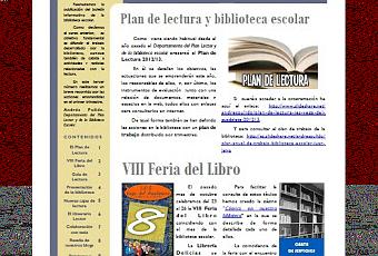 Nuestra biblioteca ha publicado en este mes que termina el primer boletín informativo del curso escolar. En él recogemos la actuaciones que se han realizado en el trimestre pasado según nuestro plan de trabajo. Las secciones de este tercer número son las siguientes:1. Plan de lectura y biblioteca escolar.2. VIII feria del libro.3. Guía de lectura Navidad 2012.4. Presentación de la biblioteca.5. Nuevas cajas de lectura.6. El itinerario lector.7. Colaboración con tesis doctoral.8. Reseña de los blogs de la biblioteca.9. Préstamo y catalogación.10. Página web de la biblioteca.11. Flickr, otra aplicación más.12. La violencia de género en el mundo del cómic.13. Novedades.