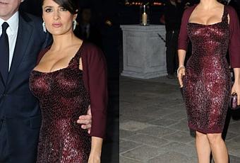 Salma Hayek y Francois-Henri Pinault .La actriz mexicana lleva un ajustado y escotado vestido bordado totalmente con lentejuelas granate, de Gucci, con complementos a juego: bolero de crep de seda, peep-toes y clutch.