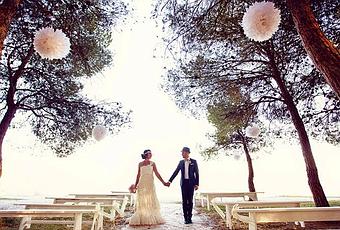 Ya sabéis que todas las semanas os enseño bodas de parejas reales, para que os puedan servir de inspiración para preparar las vuestras. En esta ocasión he elegido la boda de Belén y David para sacarla en el blog, porque me ha parecido una ceremonia entrañable llena de detalles hechos a mano y con un toque vintage que seguro que os gusta a más de una. David, que desde luego está hecho todo un manitas, restauró la cómoda e hizo a mano cada uno de los bancos de madera que veréis en las fotos. Belén y David se casaron en "La Estanca" un embalse situado cerca de Alcañiz (provincia de Teruel), un paraje donde se respiraba tranquilidad y mucho mucho amor. El vestido de novia de Belén era asimétrico (con un solo tirante) y estaba confeccionado con encaje y una tela que simula el ganchillo. ¡La verdad es que es precioso! Completó su look con un tocado vintage y un recogido lateral que le favorecía un montón. Su ramo de novia estaba formado por peonías abiertas en tonos rosas y naranjas.Para la decoración de la boda utilizaron varios elementos que consiguieron darle el efecto vintage buscado: libros antiguos, un reloj, pompones, una jaula, banderines de tela... ¡Disfrutad de las fotos y tomad muchas ideas!