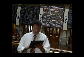Un periodista trabaja en el parqué de la Bolsa de Madrid el 20 de julio de 2012