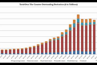 Al 31 de diciembre del año pasado el total de derivados era de 601 billones de dólares, como señalamos en este post. Al 30 junio de este año la magia del sistema lo hizo crecer hasta los 707 billones de dólares. Esta cifra representa el mayor número conocido para estos instrumentos financieros y da cuenta que la burbuja de derivados se sigue hinchando a niveles de alta irracionalidad que no tardarán en hacerla reventar. La información fue publicada este sábado en el último reporte del Banco de Pagos Internacionales (BIS, por su siglas en inglés. Aquí enlazo el documento.