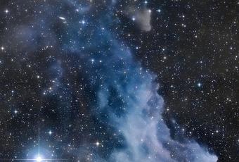 "Afán y desazón redobla; queme el fuego, borbotones la olla… ". Quizás Macbeth debería haber consultado la nebulosa Cabeza de la Bruja. Esta bruja cósmica, una nebulosa de reflexión de forma sugerente, está a unos 800 años luz de distancia. Su rostro aterrador parece mirar hacia la cercana estrella de Orión llamada Rigel, cerca del borde derecho de esta imagen, fuera de campo. Conocida más formalmente como IC 2118, esta nube interestelar de gas y de polvo tiene unos 70 años luz de diámetro, y sus granos de polvo reflejan la luz estelar que proviene de Rigel. En esta composición, el color de la nebulosa está causado no sólo por la intensa luz azulada de la estrella sino porque los granos de polvo dispersan la luz azul de manera más eficiente que la roja. Es el mismo proceso físico que el cielo diurno de la Tierra aparezca azul, aunque los dispersores de la atmósfera de la Tierra son moléculas de nitrógeno y de oxígeno.