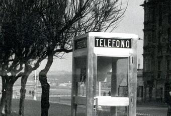 La fotografía está disparada en los antiguos jardines del Náutico, antes de cometer la barbarie arquitéctonica que vino pocos años más tarde. La cabina, verdadera protagonista de la instantánea, es un plastón urbanístico con tintes surrealistas, pero nos salvó tantas veces de la formidable bronca paterna avisando cinco minutos antes de la hora límite, que su presencia llegó a hacerse familiar entre los adolescentes de los años setenta. Los recuerdos de aquella época permanecen en mi memoria a todo color, casi como si hubiesen sucedido ayer; años antes, las imágenes de un chiquillo repeinado paseando junto a un hombre mucho más joven que yo ahora mismo, no llegan más allá del blanco y negro de las fotografías que no me atrevo aún a publicar.