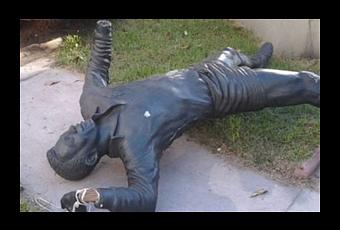 La escultura sufrió daños significativos al caer de su base, tanto en las extremidades como en el revestimiento total.