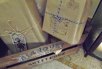 Una caja de fruta teñida de color castaño y barnizada,adornada con stencil en el frontal y unas ruedecitas alberga regalitos de Navidad