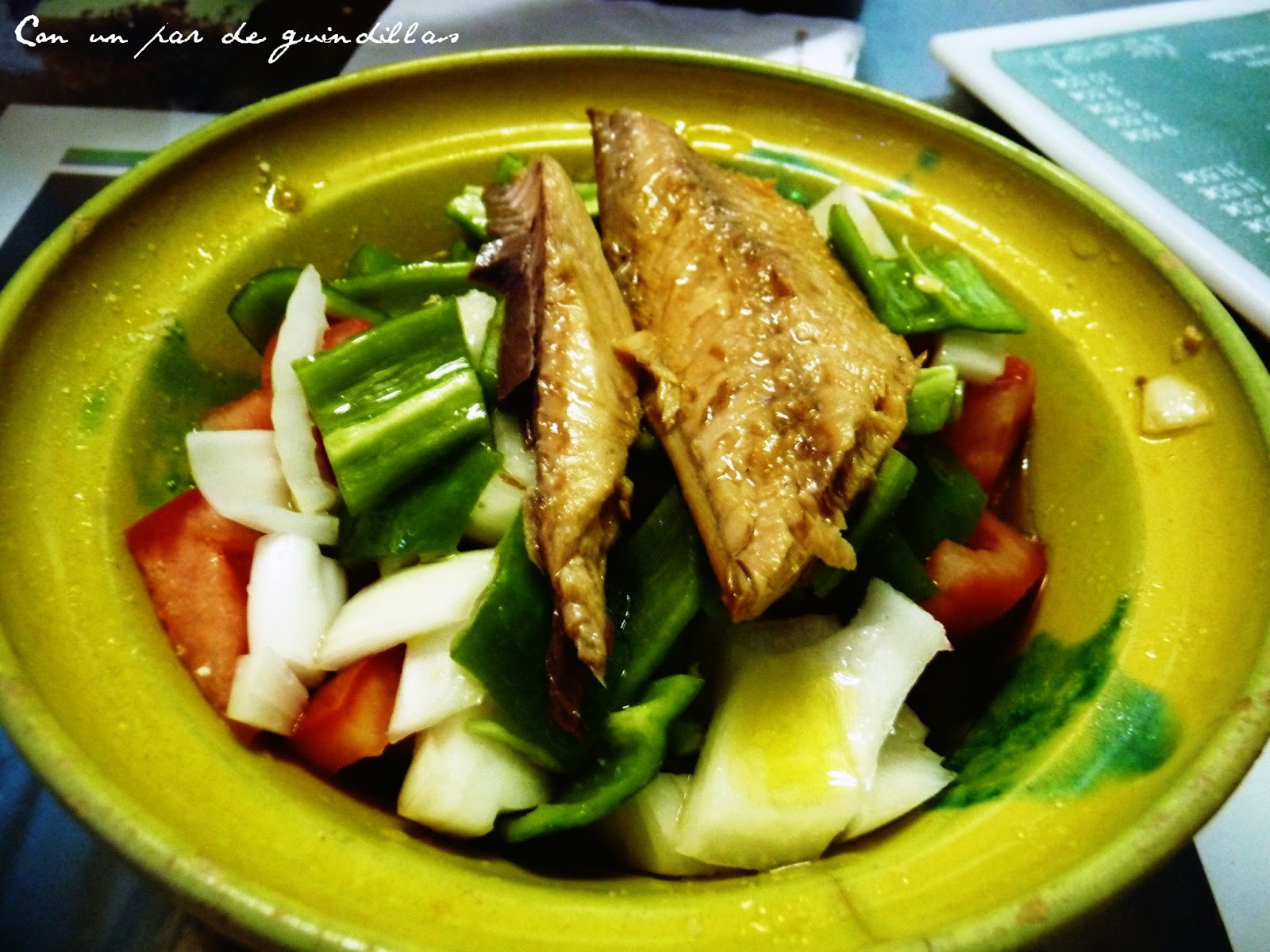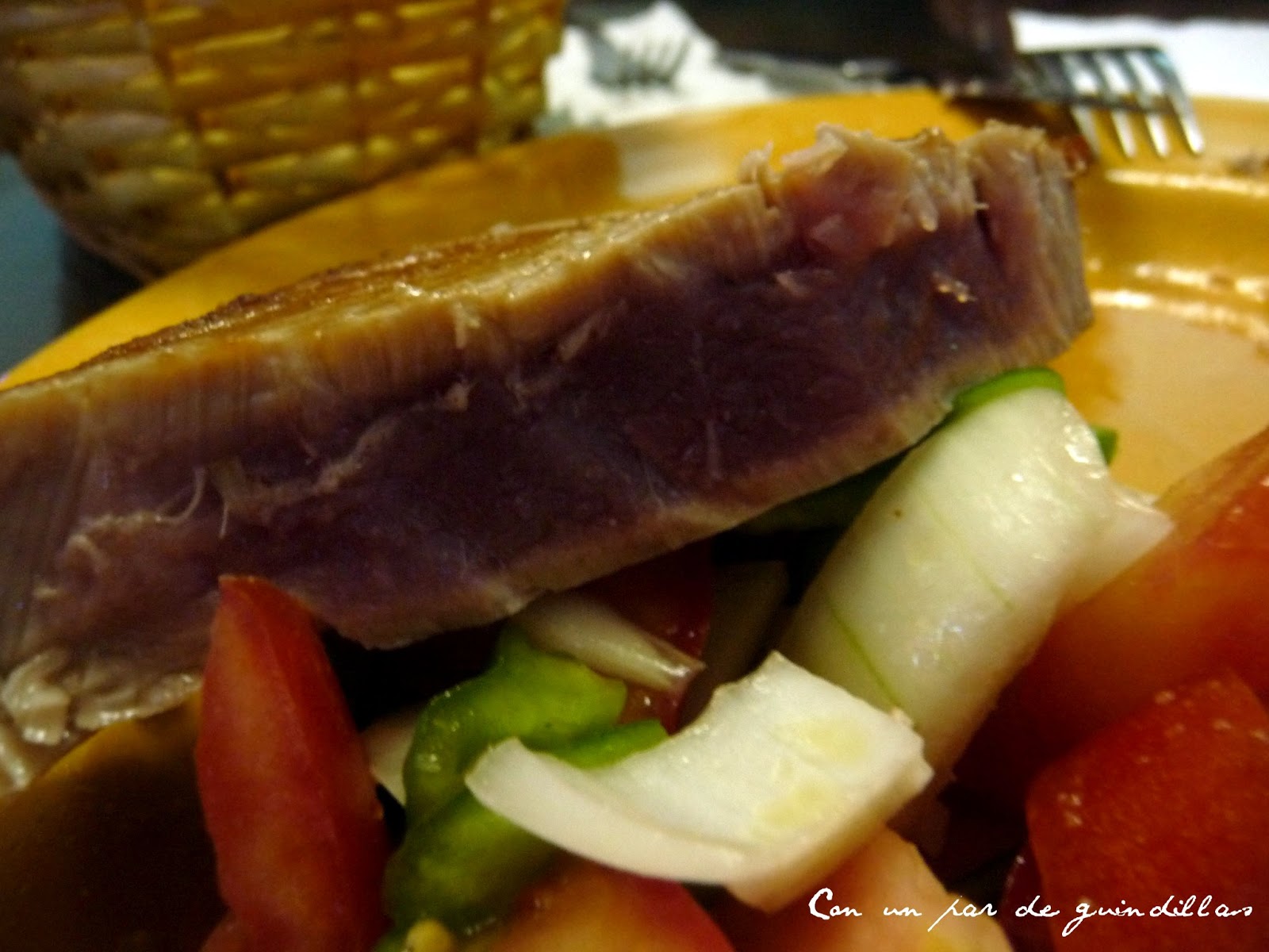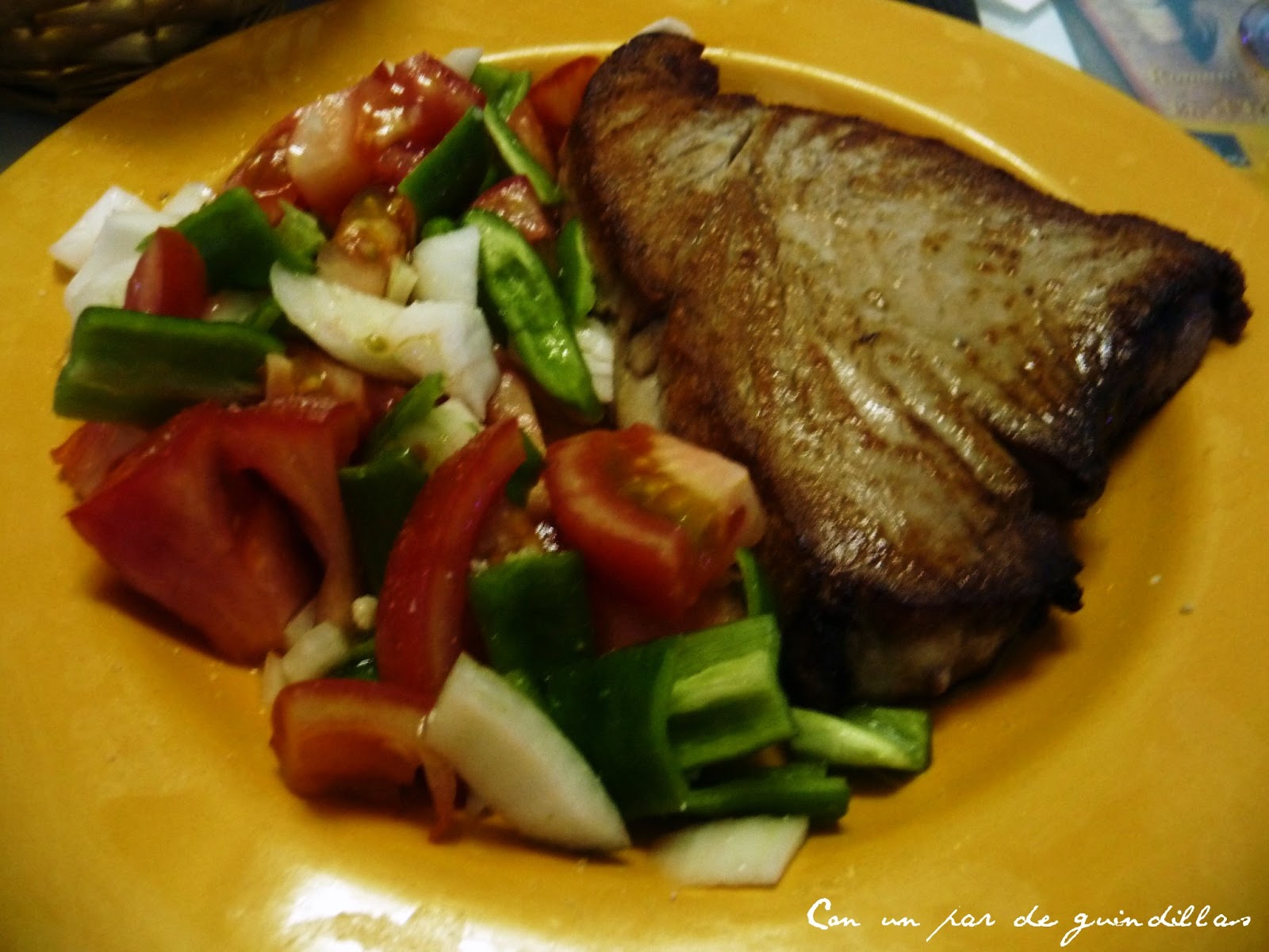 y pimientos (me pierde esta combinación) y, por supuesto, un buen trozo de atún a la plancha.