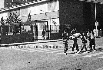 Imagen de la cale Panaderas, del barrio de El Arroyo, en 1984. Se puede ver el CEIP Aula III, que fue construido en 1981. Además a varias personas cruzando por un antiguo paso de cebra, el actual está a 5 metros más al norte, a la altura del cubo de basura que se ve en la imagen.