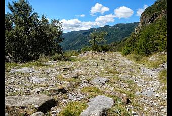 Seguimos. Al cabo de poco rato entramos en la calzada romana, una variante del Camino de Santiago. Esta vía era una de las principales vías que atravesaban los Pirineos y conectaba Zaragoza (Caesaraugusta) con la ciudadela de Beneharnum, en el Bearn francés. En los tramos más estrechos, los romanos tuvieron que levantar grandes muros para poder conservar la anchura característica de la calzada. Aún hoy podemos ver algún vestigio de estos muros.