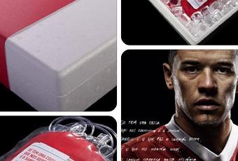 El llamativo packaging de la camiseta consiste en una caja llena de cubos de gel que simulan ser hielo y una bolsa de sangre (de las que se utilizan en las donaciones) dentro de la cual viene la camiseta.