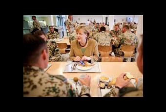 Angela Merkel come junto a soldados alemanes este 10 de mayo de 2013 en Kunduz, Afganistán