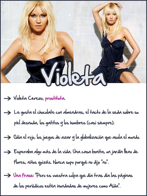 Cada uno de los personajes es especial a su manera, y tenía muchísimas ganas de conocerlos desde que Leara subió las fichas de los principales en su blog (click en los nombres para verlas). Aída es una mujer débil, maltratada e insegura que despierta un sentimiento de protección desde el primer momento y se hace querer. Violeta es justo lo contrario, pero a la vez son muy parecidas: ella le planta cara al mundo, es fuerte, orgullosa y con las ideas claras. Bruno es un enfermero que se encariña demasiado con sus pacientes y al que hay que querer sí o sí. Y un corto etcétera de varios personajes que caerán mejor o peor: Canio, Fran, Daniela, Carlo,…